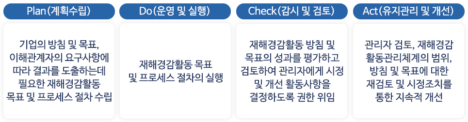 | Plan | 3절 재해경감 활동 관리체계 | 재해경감활동관리체계 기획을 위한 기업 경영현황 분석, 요구사항 및 범위, 최고 경영진 및 관리자의 역할, 운영 지원 등에 대한 사항 |